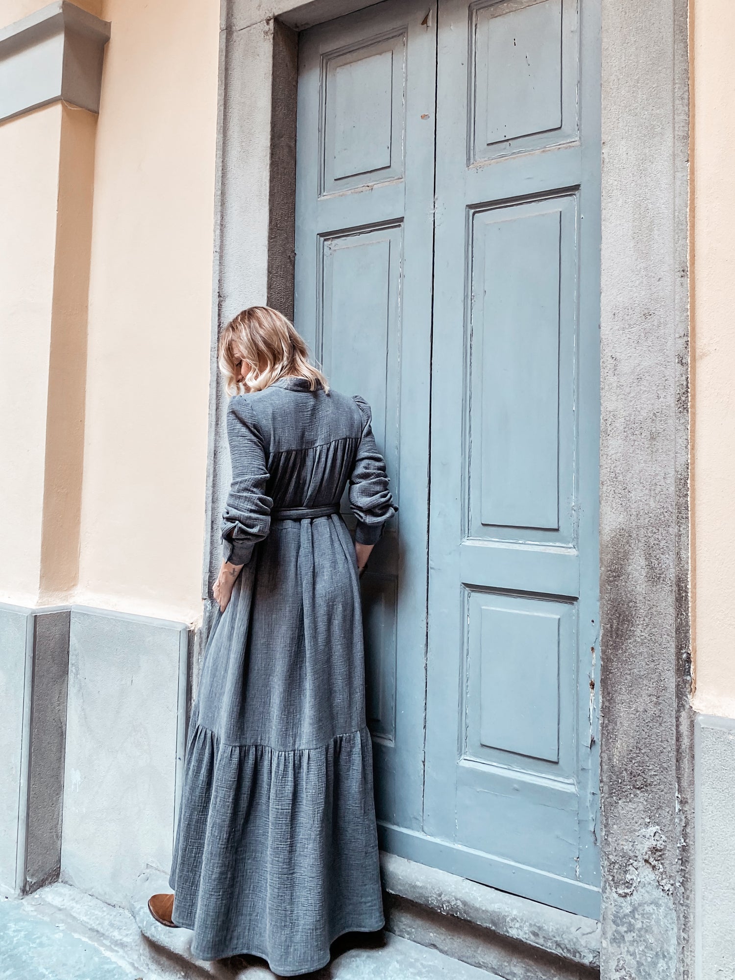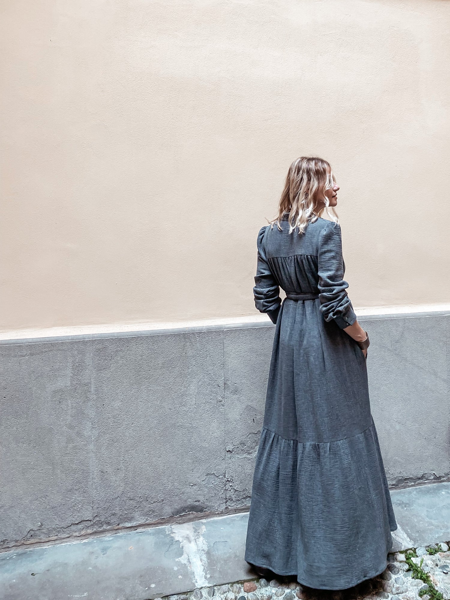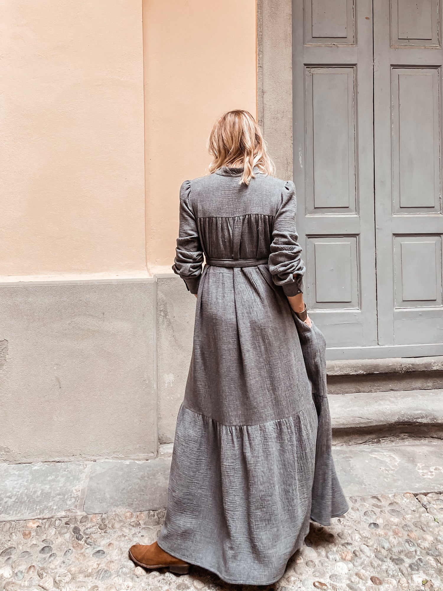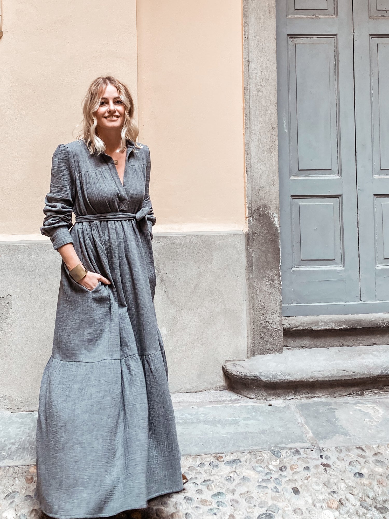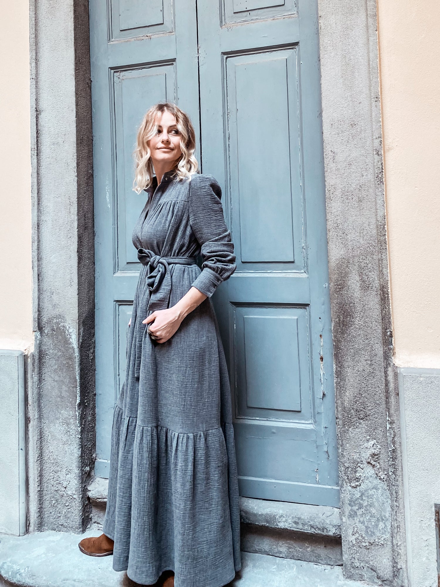 Nidawi Flat - abito lungo in Garza mélange di Cotone Organico ,1 bottone sul collo alla coreana , tasche al fianco , fusciacca in suo tessuto .