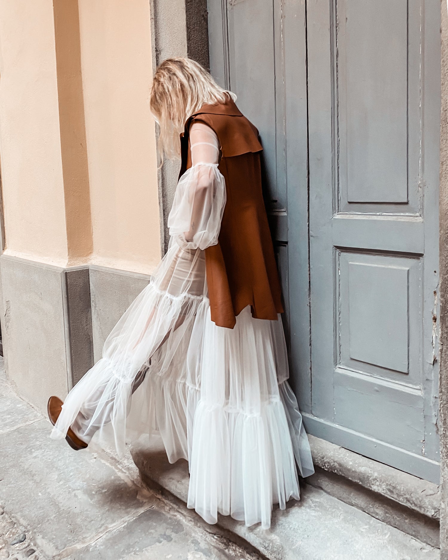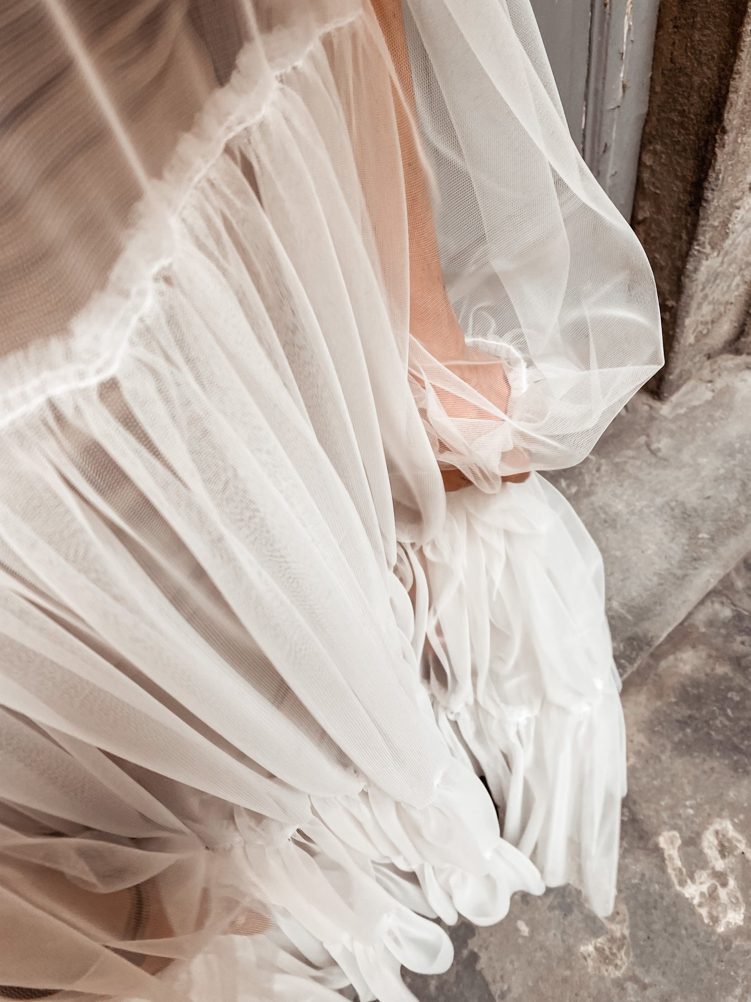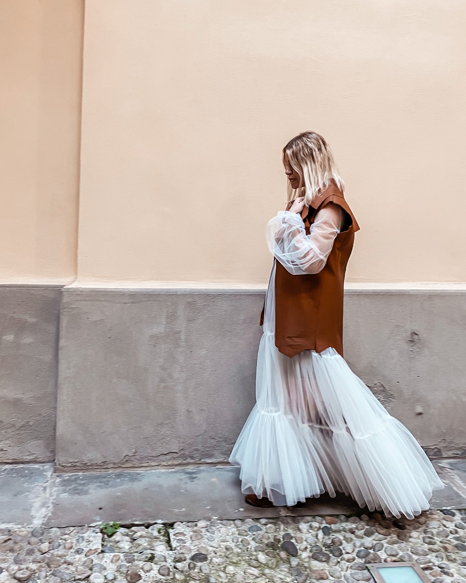 Luce - abito in tulle , balze , manica a palloncino + mini abito in Jersey stretch uso servizio . ( non comprende il gilet di nappa )