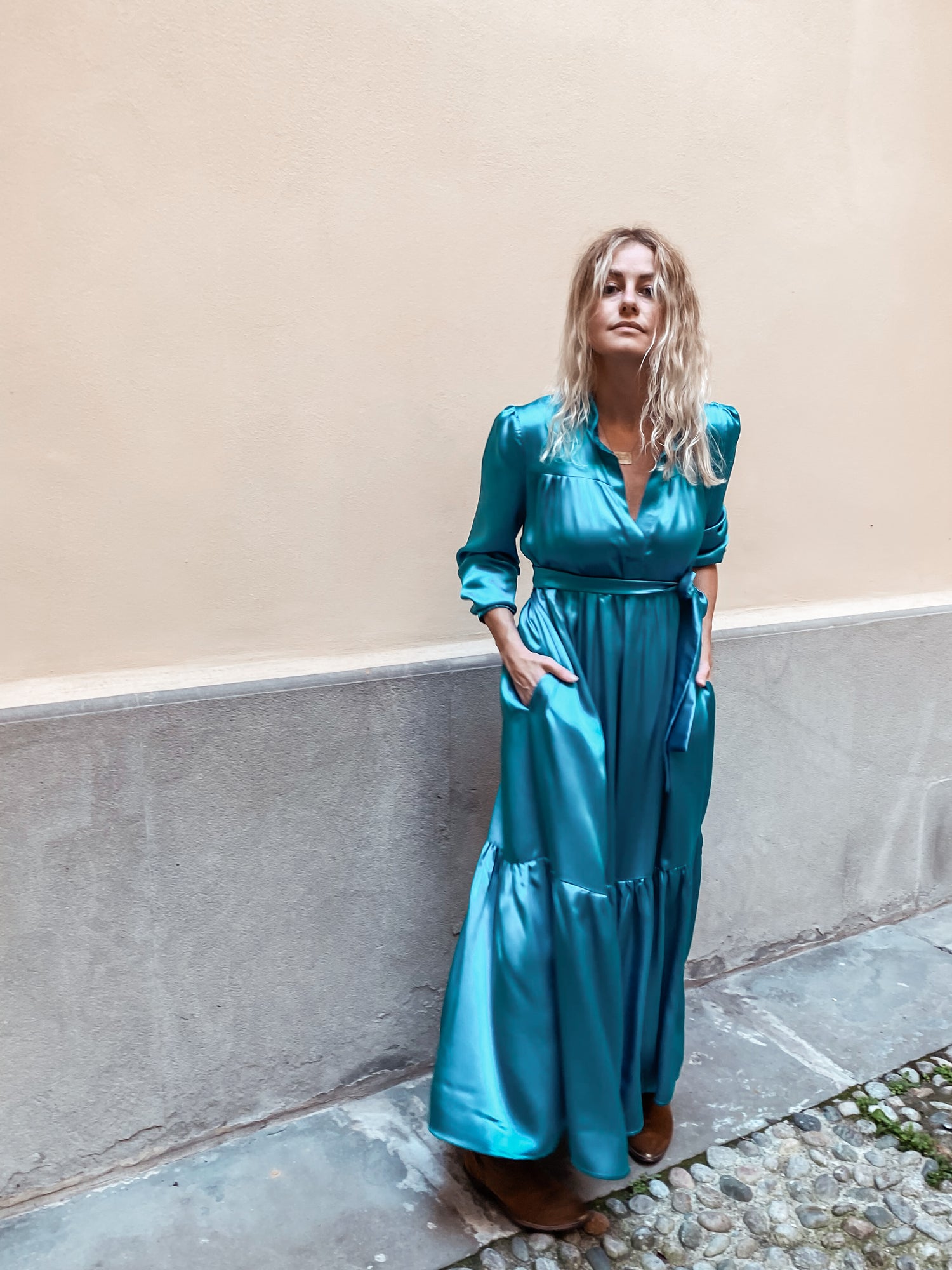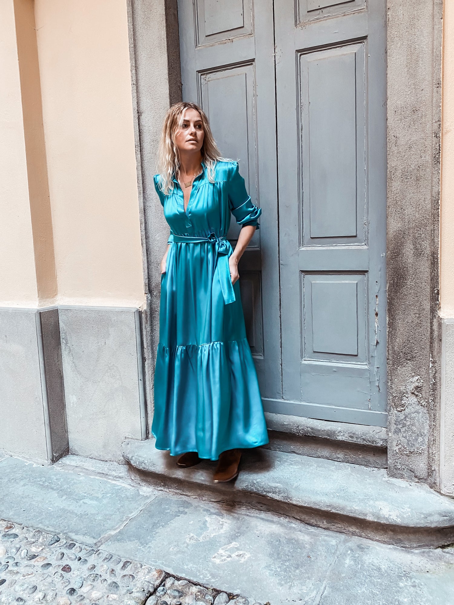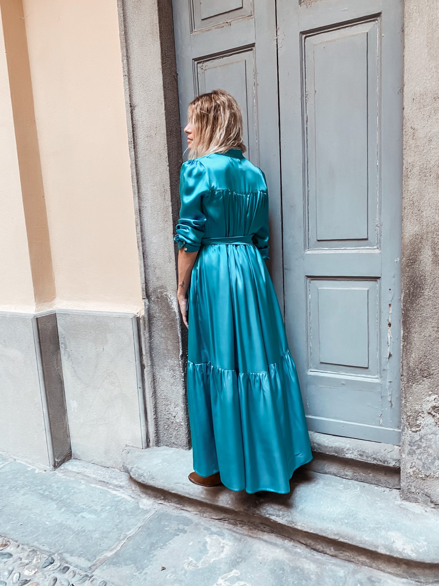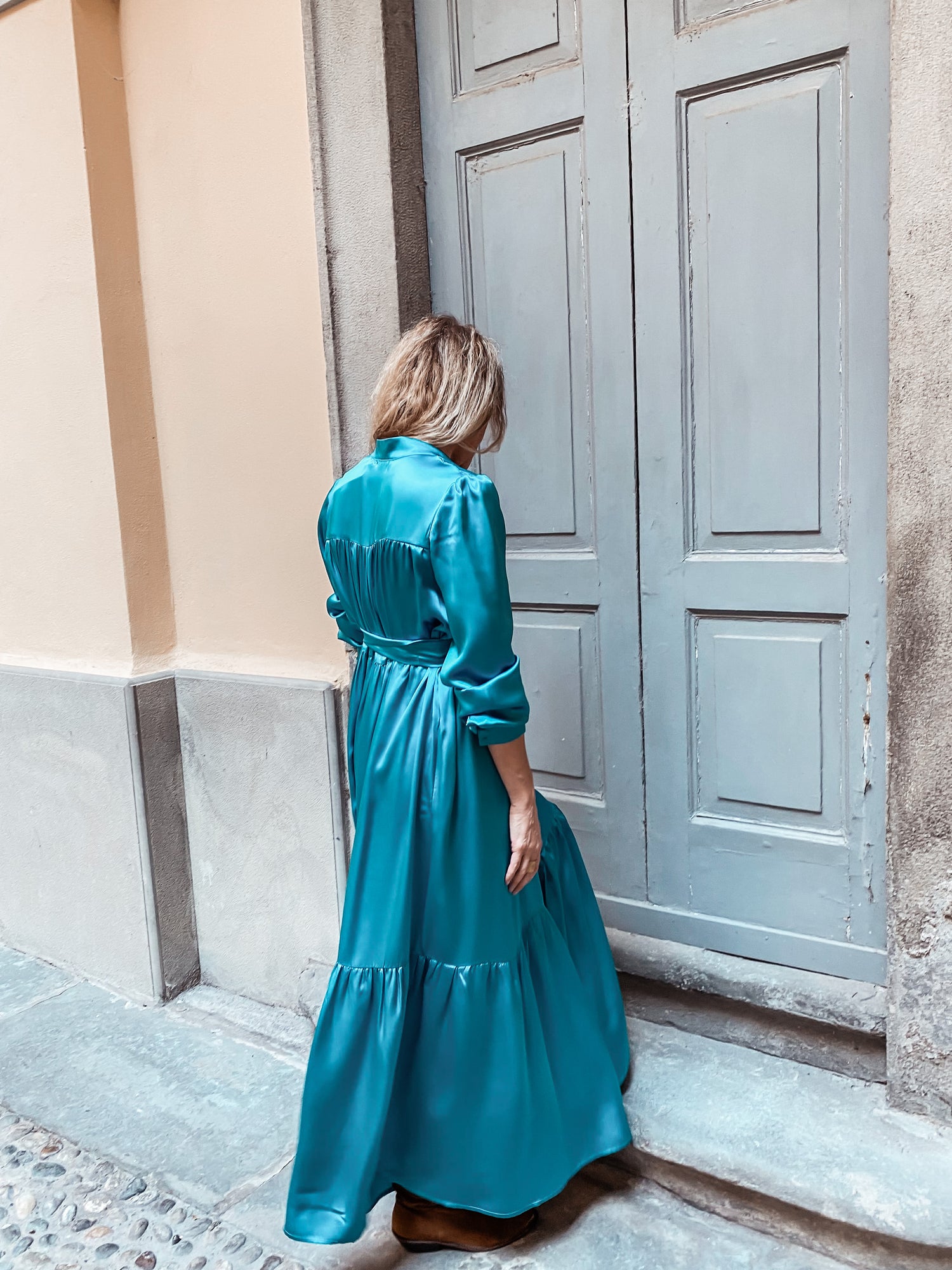 Nidawi Flat - abito lungo in pura seta ,1 bottone sul collo alla coreana , tasche al fianco , fusciacca in suo tessuto .