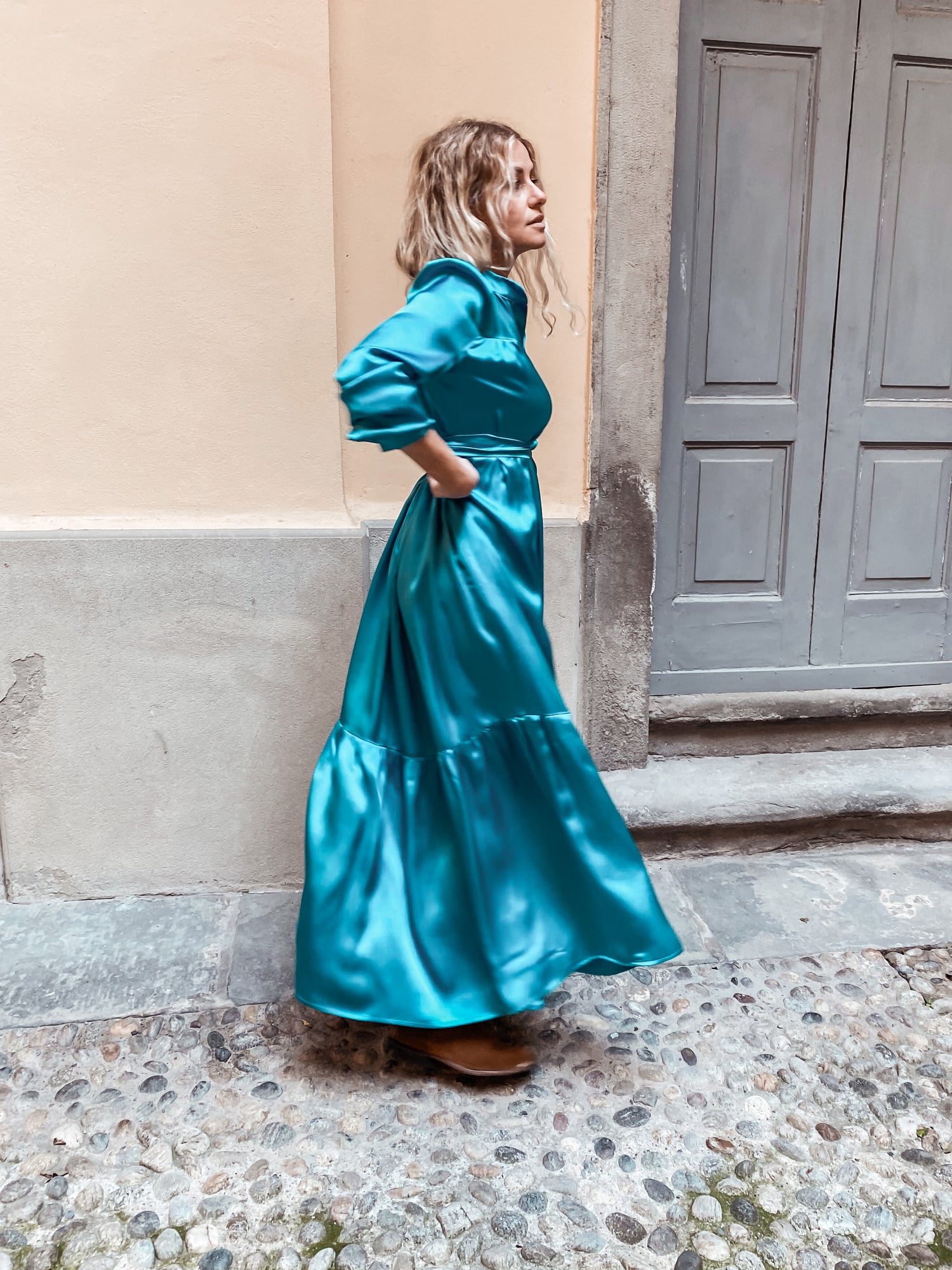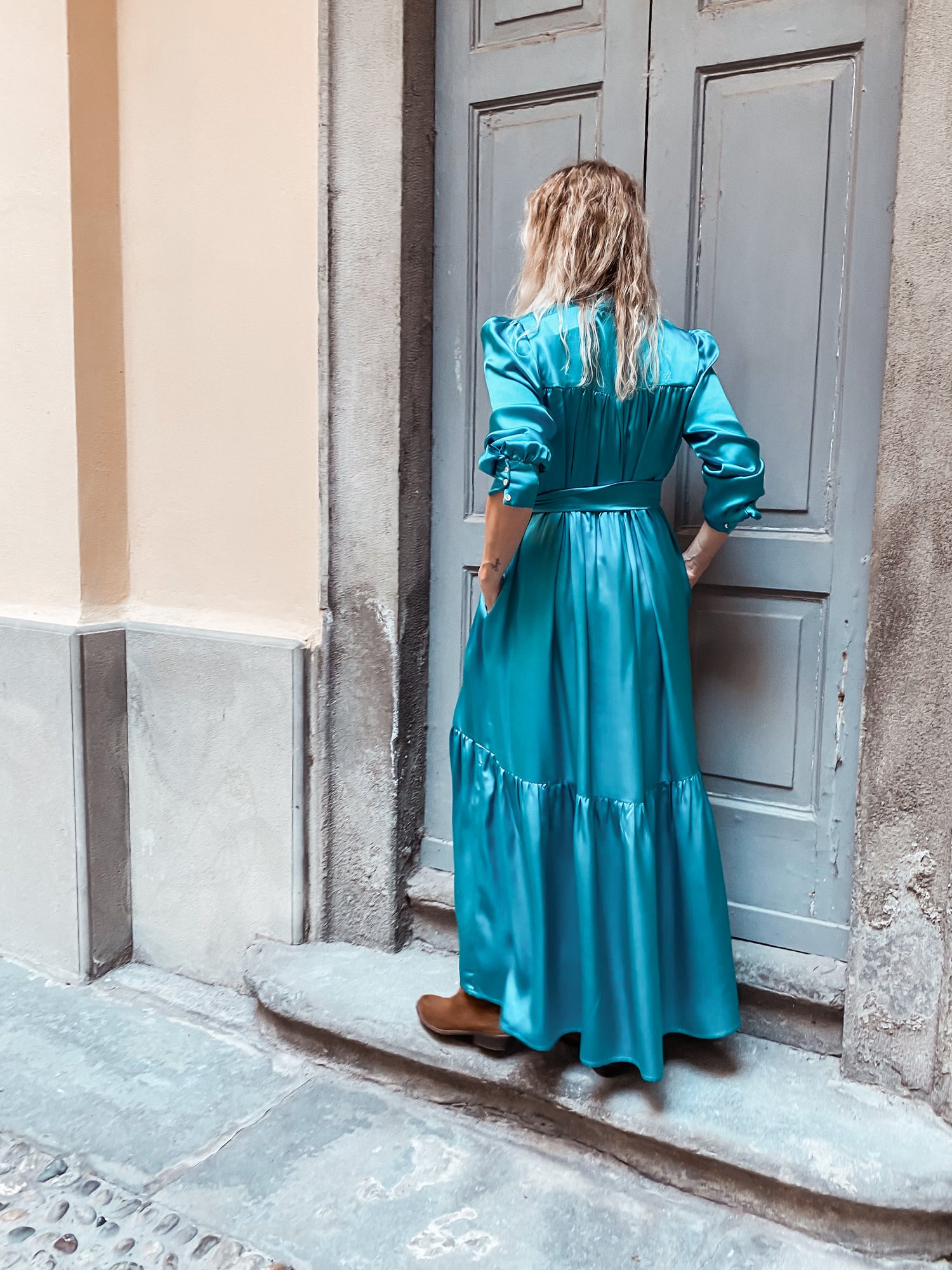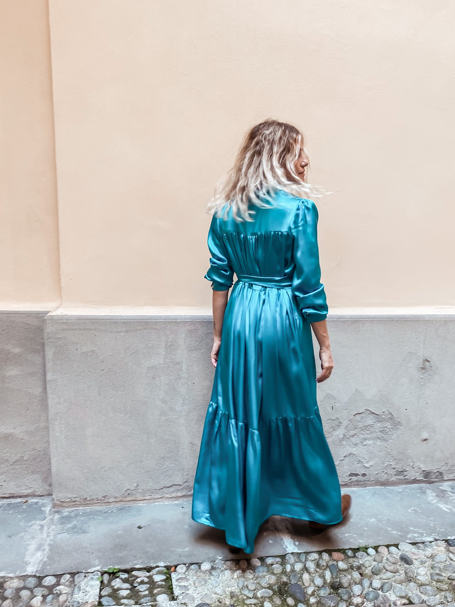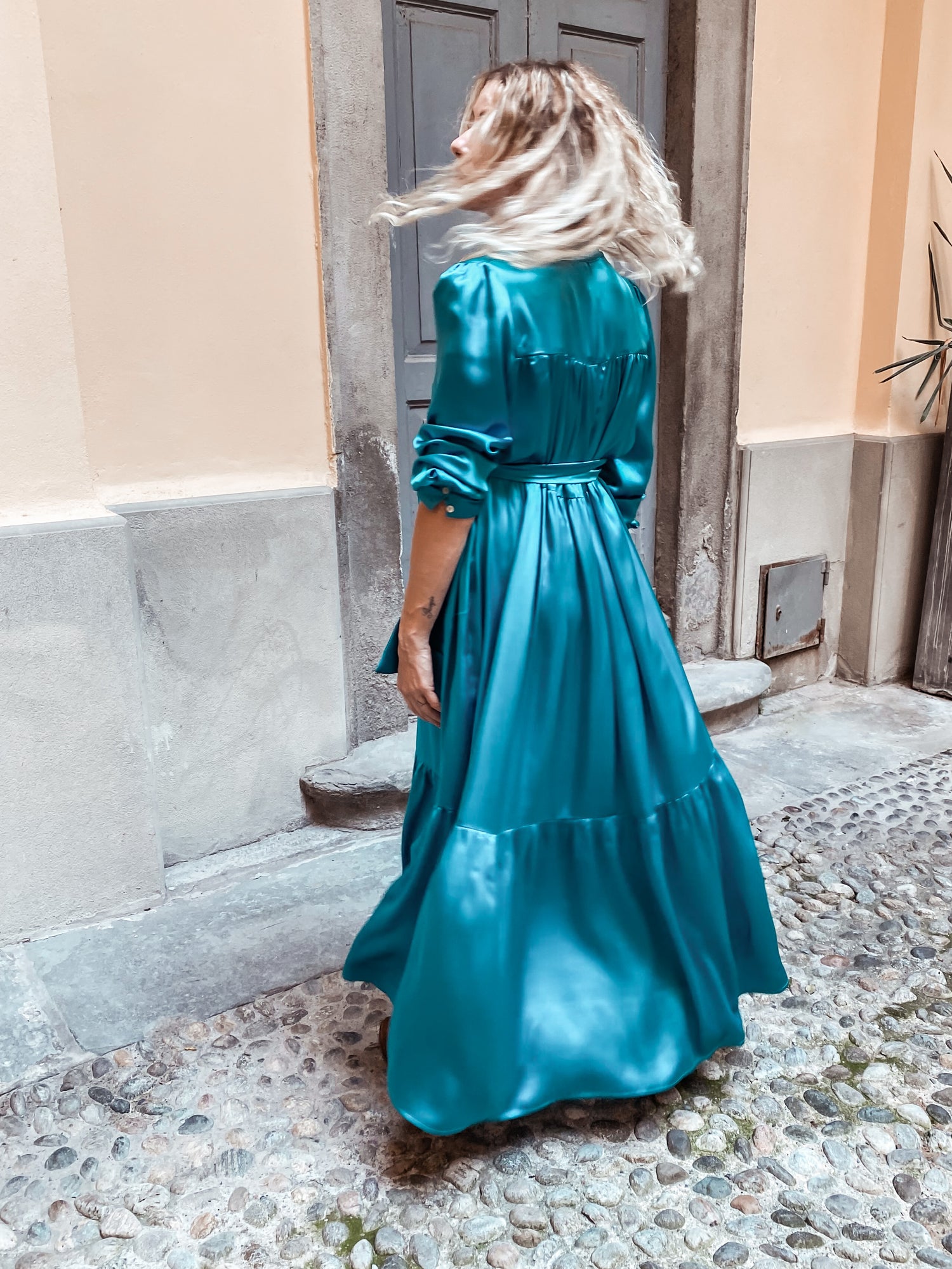 Nidawi Flat - abito lungo in pura seta ,1 bottone sul collo alla coreana , tasche al fianco , fusciacca in suo tessuto .