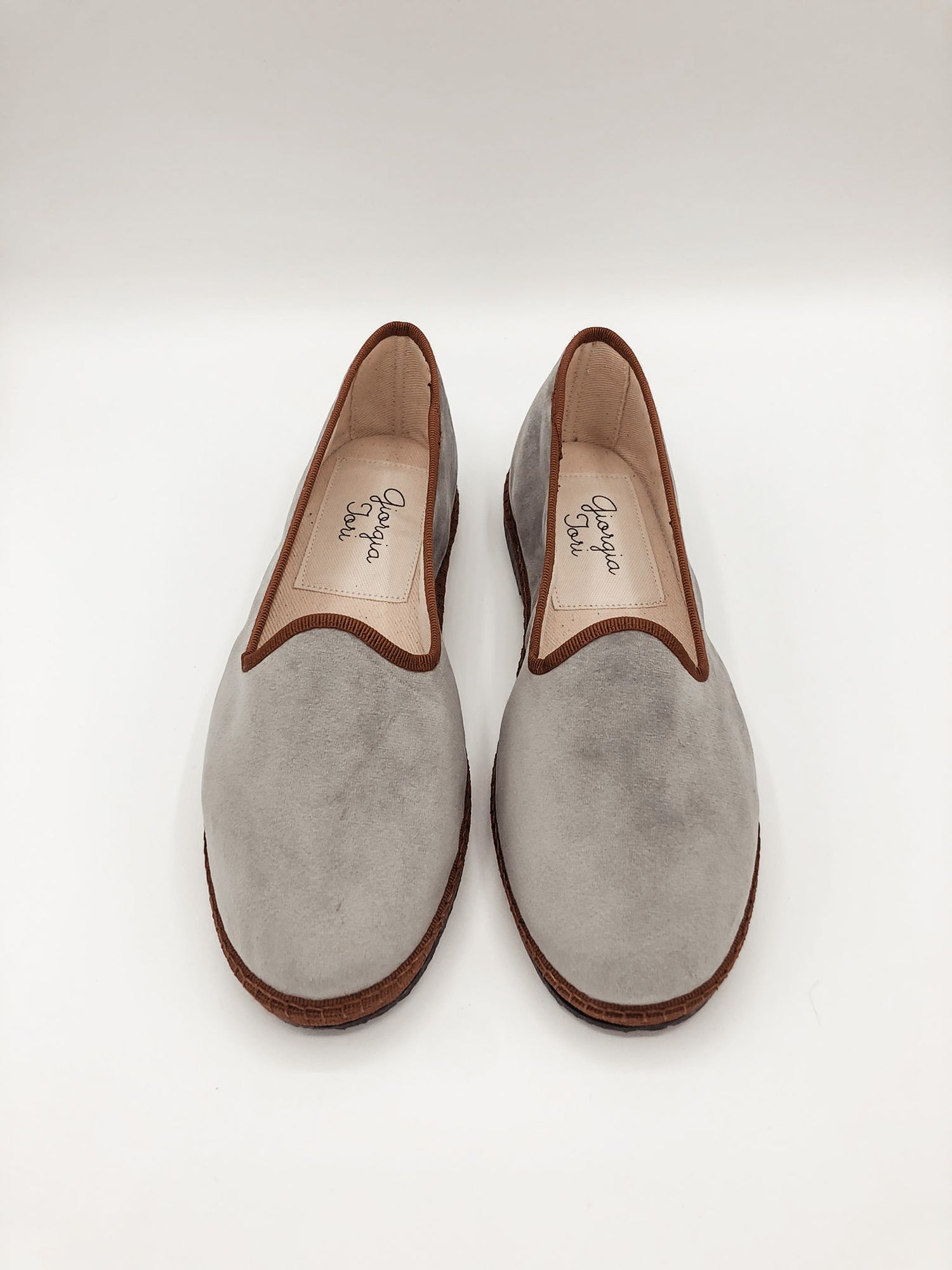 Pantofolina mod classica friulana in velluto colore Grigio Taupe, bordi gross in color Terra .